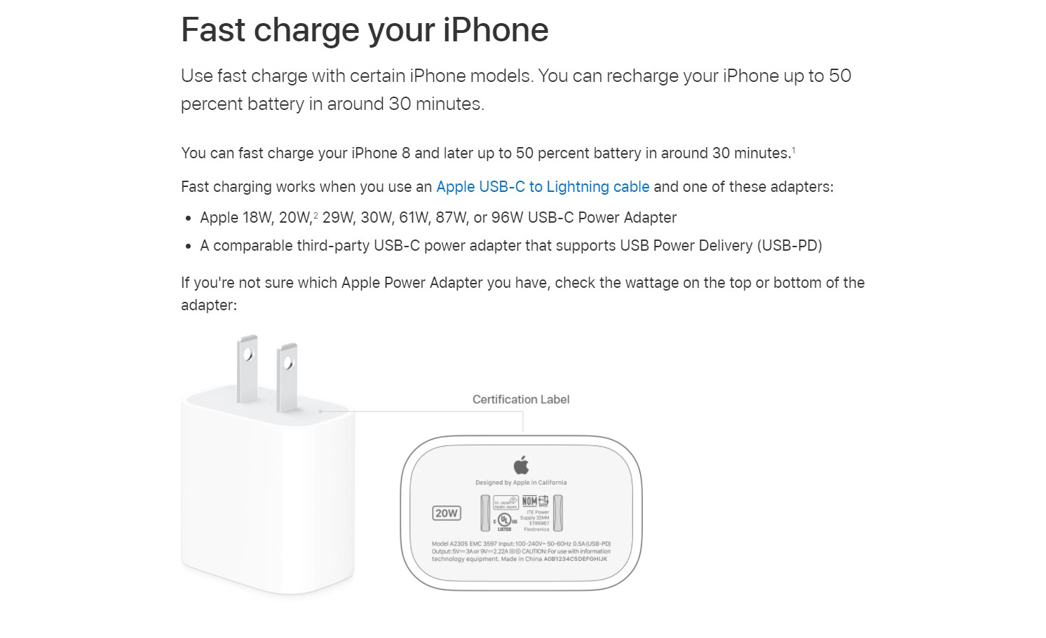 Cũng theo trang hỗ trợ của Apple, iPhone sẽ sạc nhanh khi sử dụng với các bộ đổi nguồn có công suất tối đa là 96W (củ sạc MacBook của Apple). Như vậy điều kiện đầu tiên đó là bạn phải có 1 củ sạc có công suất rơi khoảng 18W cho đến 96W. Cụ thể như sau: 18W, 20W, 29W, 30W, 61W, 87W hoặc 96W.