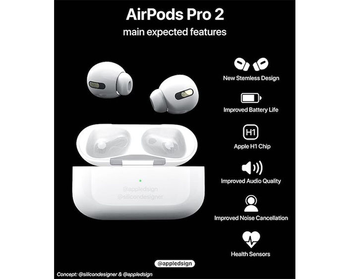 Nhiều chuyên gia dự đoán AirPods Pro 2 có thể sở hữu vẻ ngoài hoàn toàn “lột xác” để trở nên khác biệt so với những tai nghe không dây khác của Apple. Phần thân sẽ được làm ngắn hơn nữa, các nâng cấp khác gồm khả năng khử tiếng ồn và chất lượng âm thanh cũng sẽ tốt hơn. Theo các nguồn tin cho hay, Apple đã được trao một số bằng sáng chế mới và một trong số đó gợi ý rằng AirPods tiếp theo có thể đi kèm với một tính năng giúp chúng gắn chặt vào tai người dùng hơn để họ có thể yên tâm sử dụng khi tập thể dục hay chạy bộ, sản phẩm cũng được mong đợi sẽ sở hữu cảm biến hỗ trợ theo dõi hoạt động thể chất và chắc chắn sẽ được hỗ trợ tính năng sạc MagSafe như trên AirPods 3.